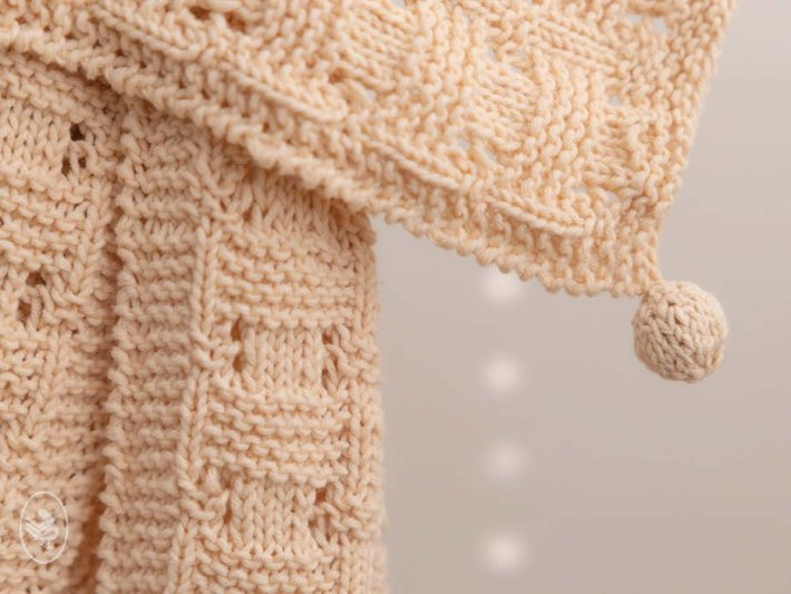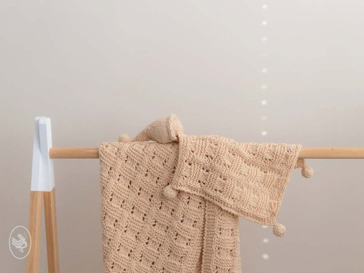 Een schattige set om te breien; deze babydeken met bijbehorend knuffeltje. Het lieve babydekentje wordt van beneden naar boven gebreid in een open-manden-steek met een rand gebreid in ribbelsteek. Het lapje voor het knuffeltje wordt in heen- en weergaande rijen in de open mandensteek gebreid, het hoofd en de bolletjes worden in het rond gebreid.